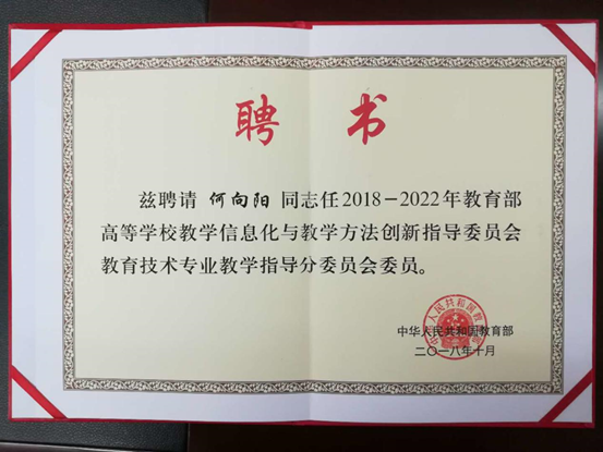 教育部高等学校教学指导委员会最早成立于1990年,是教育部聘请并领导的指导高等学校本科教育教学工作的最高专家组织,具有非常设学术机构的性质。2018-2022年教育部高等学校教学指导委员会涵盖了2个综合类、109个专业类和40个分教指委,集中了高等教育方面权威的专家,将承担高等学校教育教学研究、咨询、指导、评估和服务等工作,推动高等教育改革发展。本届教育技术学教学指导分委员共设立主任委员1名,副主任委员5名,秘书长1名,委员18名,万象城官网是唯一一个本科学院委员单位,何向阳教授是本届分委员会最年轻的委员。