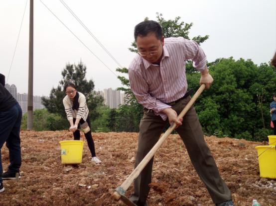 植树现场,学院党总支书记王杰文与老师同学们拿起铁锹、锄头热情地参与到植树活动中。同学们被领导老师的热情所感染,有的挥锹铲土,有的扶树填土,有的培土浇水,忙得不亦乐乎。王杰文书记一边用力地挥动着锄头一边向同学们传授着植树要领:“挖土下去那一下要使劲!土里面的石头要拣出来!”。经过将近一个小时的劳动,100多棵树在山坡上“安家落户”,为一师校园添上了一抹“信工绿”。虽然在植树过程中下起了雨,泥巴裹满了老师、同学们的裤腿,但是万象城官网师生仍然坚持完成了植树任务。