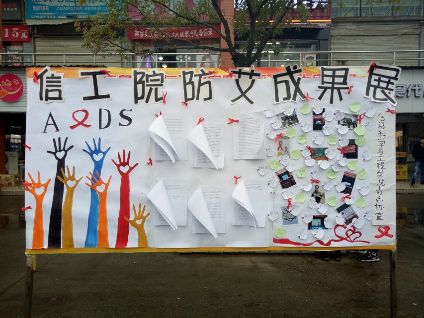 活动前期,信息科学与工程学院青年志愿者协会就防艾心得、防艾照片等基本材料进行收集与筛选,提前布置好活动展板。展板布置以防艾图标为重要标识,并增设留言板,方便学生进行留言,表达自身对防艾工作的看法。