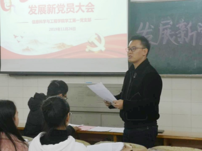 (通讯员 谢晓 肖凤辉)2019年11月26日14:30,信息科学与工程学院学工第一党支部、第二党支部发展新党员大会于玉衡北507、508教室顺利召开。党总支副书记成夏炎老师、学工第一党支部书记关红儒老师、学工第二党支部书记唐瑞鸿老师出席此次大会,学院党员教师作为入党介绍人和全体发展对象以及学生党员共同参与会议。