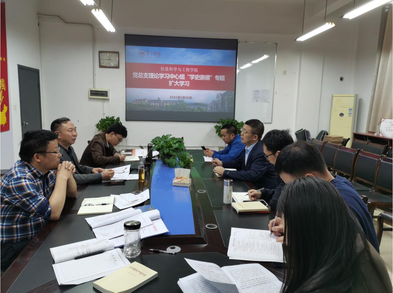 5月20日下午,学院党总支理论学习中心组在玉衡北407开展“学史崇德”专题扩大学习活动。学院领导、党总支委员及万象城官网学校第二次党代会代表参加。活动由党总支书记王杰文主持。