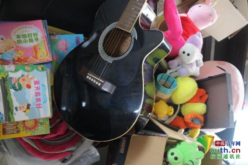 图为志愿者来学校前们为孩子们筹集的物资,有乐器、绘本、娃娃、网球等。中国青年网通讯员 段新利 摄