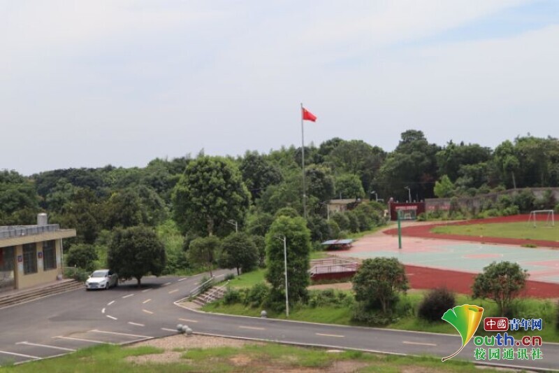 图为迎风桥镇长塘仑小学田径场中的红旗迎风飘扬。中国青年网通讯员欧阳健摄