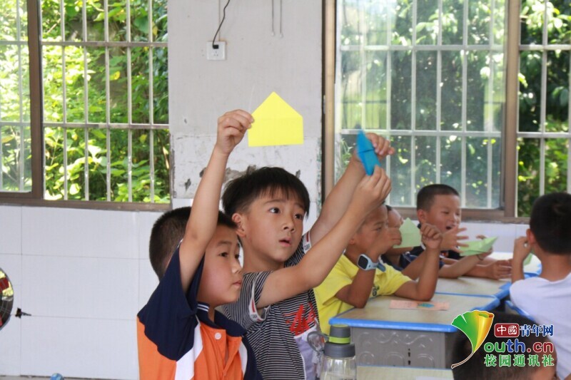图为上手工课时,学生完成自己的作品,高举作品给大家看,渴望得到大家的认可。中国青年网通讯员 欧阳健 摄