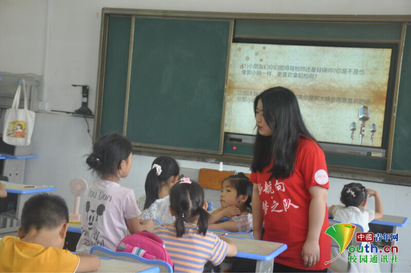 图为志愿者向学生讲述关于毛主席的儿子毛岸英的故事,学生们深受触动。中国青年网通讯员 何星逸 摄