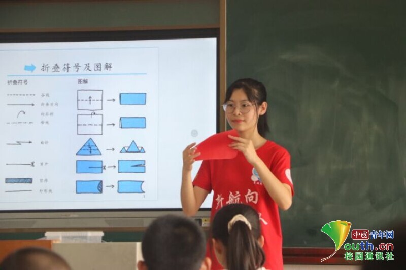 图为志愿者向孩子们演示如何将一张张彩纸折叠成爱心的形状。中国青年网通讯员 段新利 摄