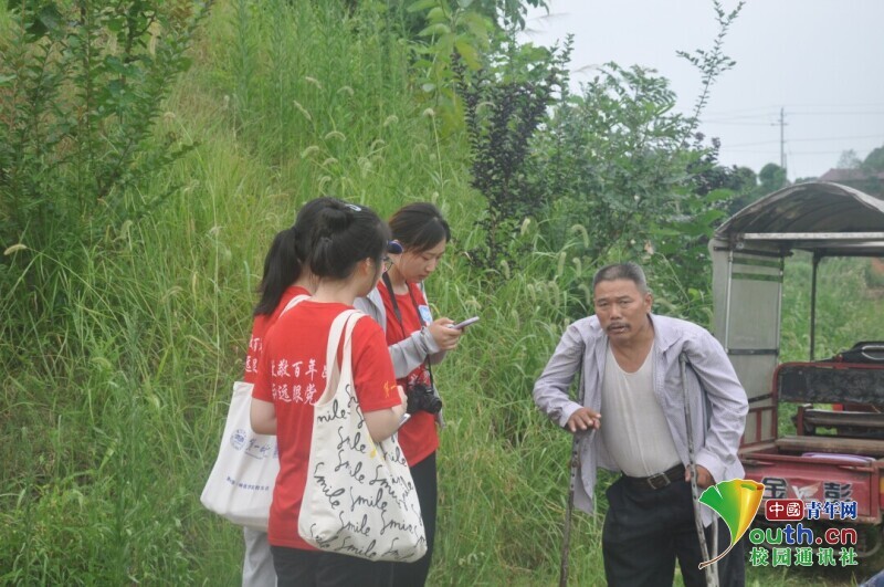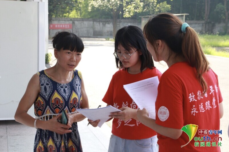 图为新航向·梦之队志愿者询问迎风桥镇居民是否了解国家大学生资助政策,并有针对性地介绍资助政策。中国青年网通讯员 欧阳健 摄