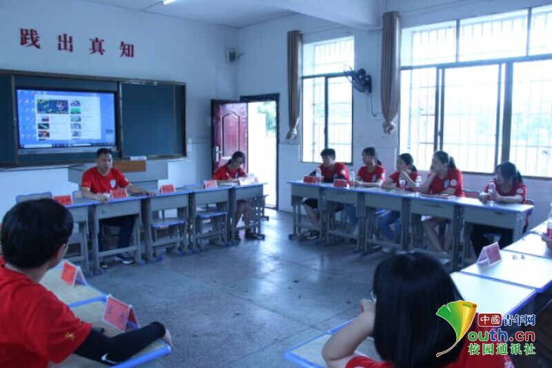 图为新航向梦之队队员们与资阳区镇府以及长塘仑小学的领导们会面交谈。中国青年网通讯员 欧阳健 摄