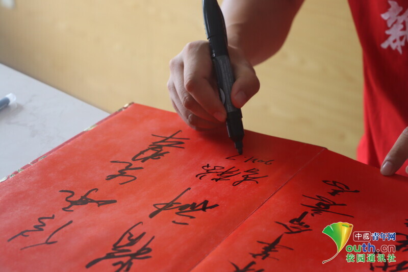 图为带队老师李荣敬在张国基纪念馆的留言本上写下对新一代青年的期望。中国青年网通讯员 段新利 摄