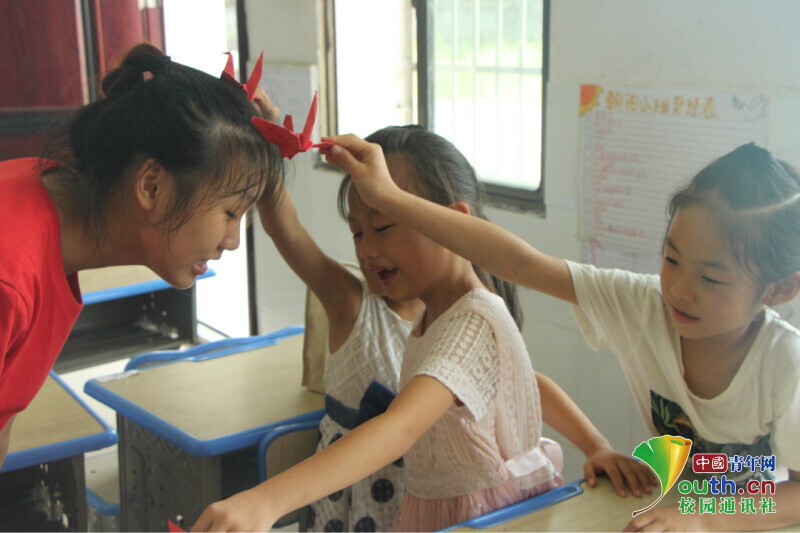 “老师您看我们的千纸鹤,可好看啦!”图为课间,学生害羞地叫来老师,向志愿者老师展示自己亲手做的千纸鹤,并且和志愿者老师玩起了游戏。中国青年网通讯员 马唯一 摄