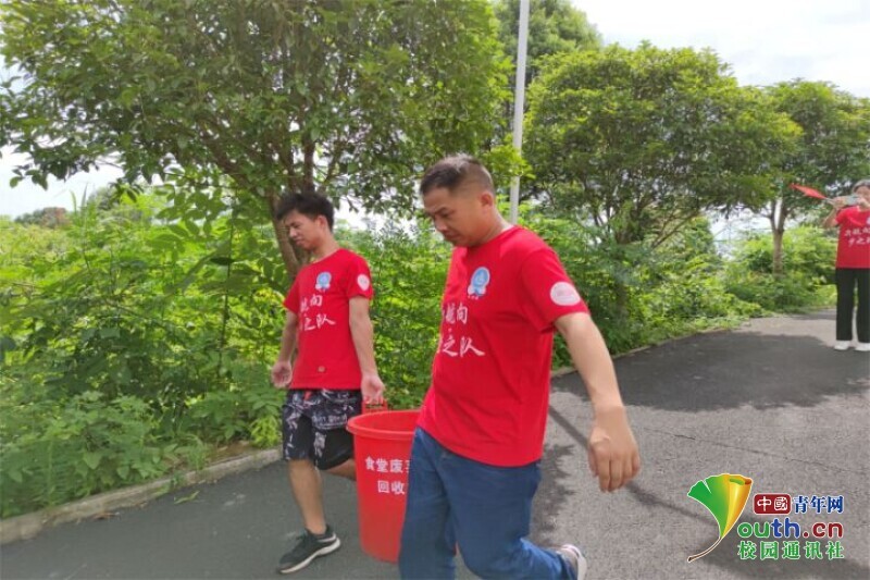 图为带队老师与队员倾倒食堂垃圾。中国青年网通讯员 欧阳健 摄