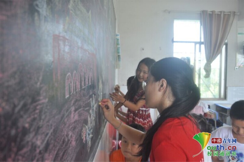 图为同学们正在和班主任一起画主题为“童心向党,铭记党史”的黑板报。中国青年网通讯员 欧阳健 摄