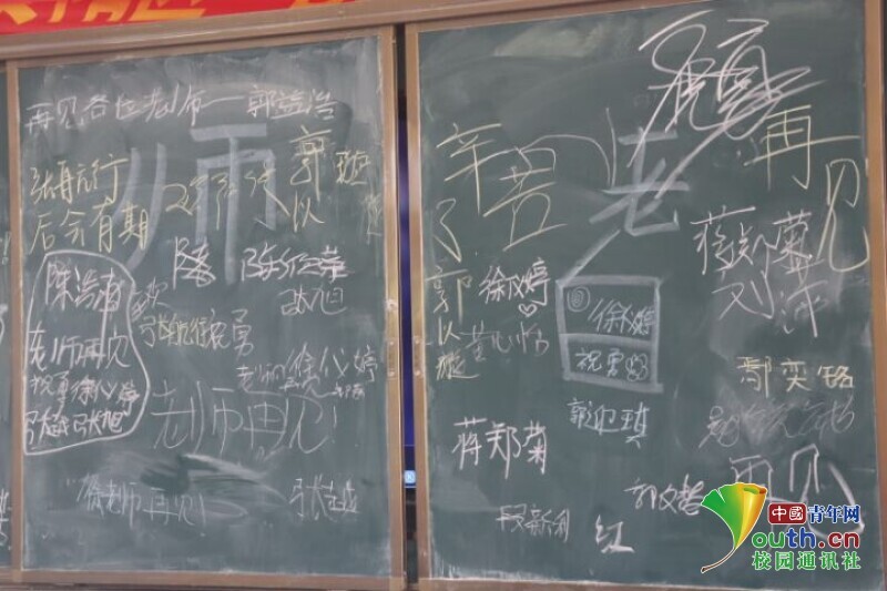 图为同学们在黑板上写下给所有老师的告别留言。中国青年网通讯员 段新利 摄