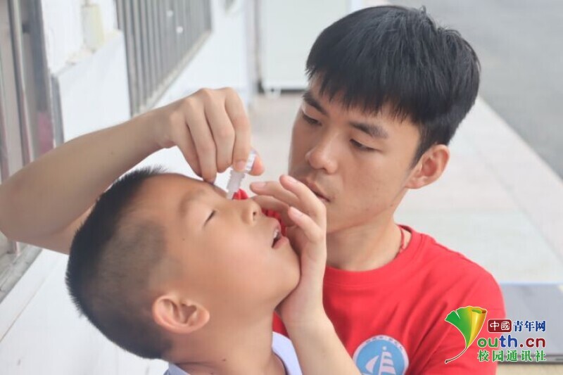 支教过程中,班里一位感染了眼疾的同学需要每隔1小时滴一次眼药水,最开始他有些羞涩,向我求助难于启齿。我了解情况后欣然承担了给他每天滴眼药水的事,总不忘提醒他按时到我身边上药;有时临时有事,我也不忘委托其他队员帮忙照顾。慢慢地,他的眼睛好转起来,嬉笑着扮着鬼脸儿。