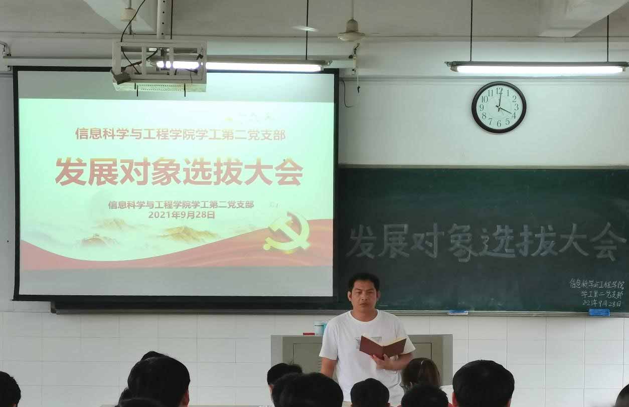 2021年9月28日,万象城官网学工第一、第二党支部通过线上与线下结合的方式召开本次发展对象选拔大会。与会人员有学工第二党支部书记李荣敬,全体学生党员和51名入党积极分子。大会分别由苏琴、张旭主持。