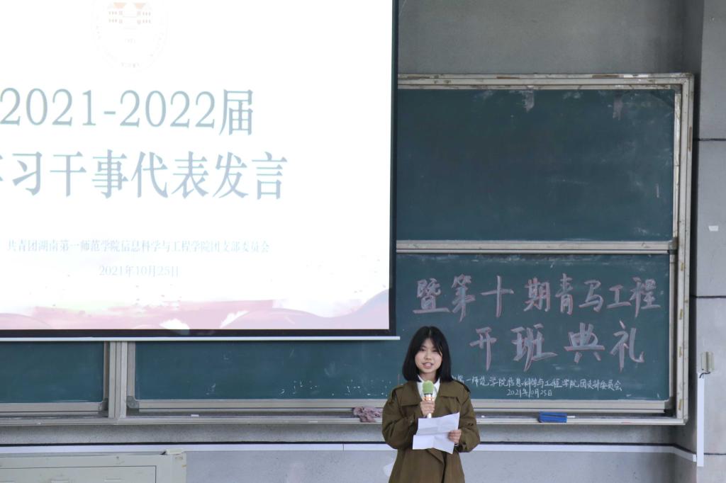 学生干事代表21级881教技班龙苗苗上台发言,展现了新一届学生干事为学院美好建设贡献出青春力量的决心。