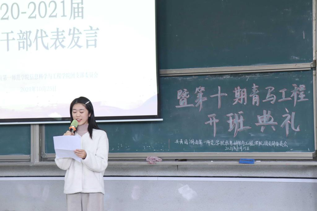 典礼在慷慨激昂的中国共青团团歌声中正式拉开序幕。一段2020-2021届团学活动总结视频过后,来自19级817教技班的徐仪婷作为学生干部代表发言。她结合自身成长经历向新一届干事们分享了工作方法与工作经验,同时鼓励新一届干事们勇于担当,敢于实践,争做新时代新青年。