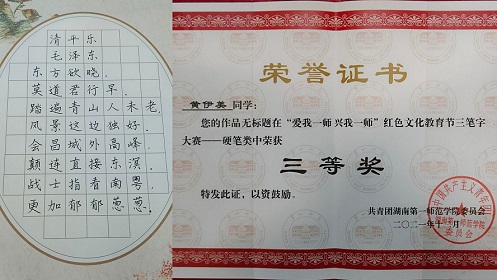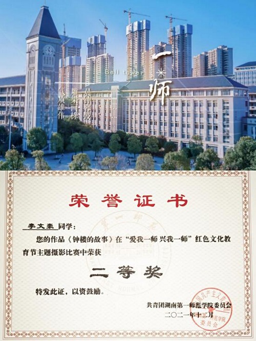 此次红色文化教育节还包括三笔字比赛、征文比赛、摄影比赛。获奖优秀作品在颁奖典礼现场陈列展出。万象城官网19级818教技班李文豪的摄影二等奖作品《钟楼的故事》,20级848教技班黄伊美的三笔字(硬笔)比赛三等奖作品《清平乐》陈列其中。