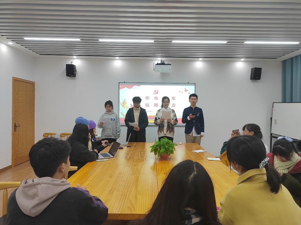 学生党员谢晓通过毛主席旷达豪迈的经典诗词分析出其艰苦朴素、严于律己、波澜壮阔、豪情万丈的形象,来向同学们心目中永远的毛主席致敬并激励同学们不忘来时路,勇敢向前行。