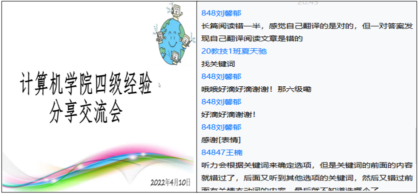 随后,五位分享嘉宾同学依次分享个人英语学习经验。其中,19计科1班莫蓓蕾同学主要就翻译部分精练提出“忠于原文”、“学会意译”、“归纳常用词”等原则和建议,让听众同学大为受益;20教技1班夏天驰同学强调听力须具备语流和相对应的语境,提供了关于如何提高听力的满满干货;20计科1班邓倩玉同学向大家分享了宝贵的写作经验,以例说理,一针见血;20级848教技班刘思娴同学则是向同学们分享了记单词的小妙招,并着重强调了每天坚持积累阅读量以及利用碎片化时间练听力的重要性。最后,20教技1班唐超超同学以诙谐通俗的语言,针对听力、阅读这两方面提出了“掌握做题方法”、“阶段性备考法”等有用建议。