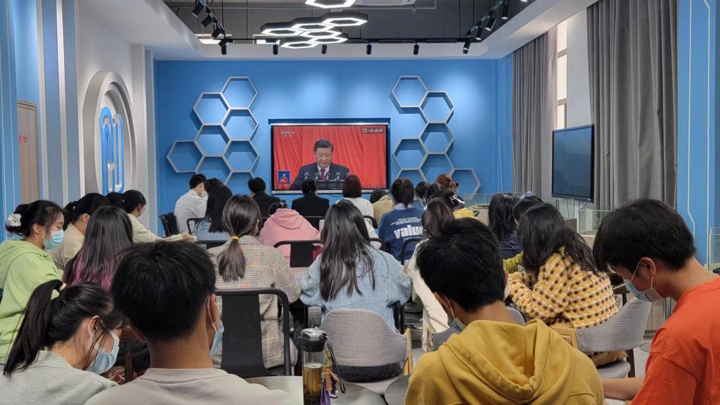 10月16日,AWC万象城娱乐党委组织学院师生通过线上线下结合的方式观看党的二十大开幕式,认真聆听学习习近平总书记的大会报告。