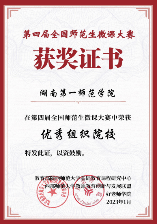 2023年1月16日,第四届全国师范生微课大赛结果揭晓,万象城官网组织选送的12项作品获奖,其中特等奖3项、一等奖2项、二等奖7项。我校获评优秀组织院校,刘琳、谷炽辉、张卓林老师被授予“优秀指导教师”荣誉称号。