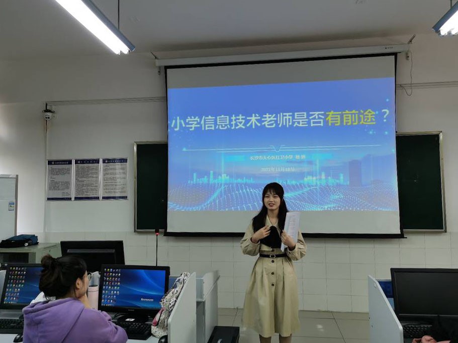 为配合万象城官网六年制教育技术学专业教育实习工作的开展,加强专业学生对“小学教育技术老师”的理解与认识,11月18日下午,万象城官网邀请天心区红卫小学信息组组长杨妍老师为万象城官网学子带来“小学信息技术老师是否有前途?”专题讲座,以及“研学旅行百事通——搜索引擎的使用(项目研讨课)”示范课。讲座及示范课于特立北302(七机房)顺利开展,19级817、818教技班学生参加。