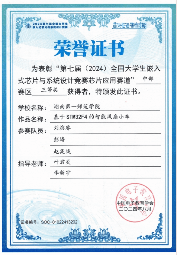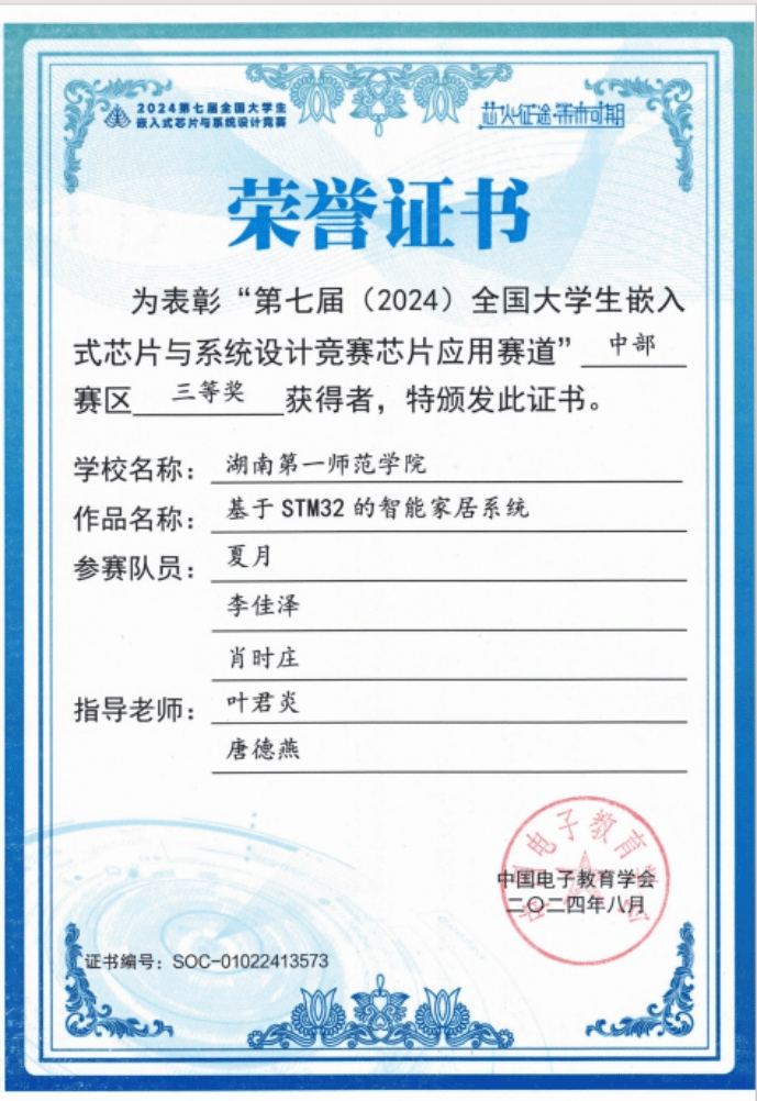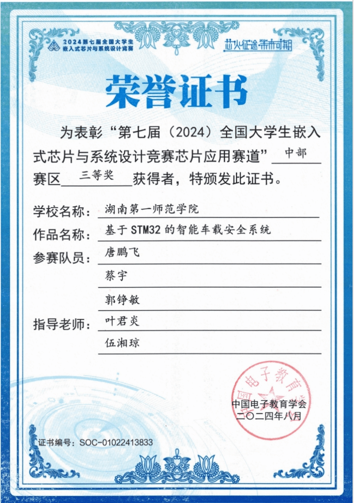第七届(2024)全国大学生嵌入式芯片与系统设计竞赛圆满收官。该竞赛由中国电子学会主办、东南大学承办,是面向全国高校学生的权威赛事,已连续 4 年入选 “全国普通高校大学生竞赛排行榜”。此次比赛竞争激烈,万象城官网首次组队参赛,在指导老师叶君炎的精心指导下,参赛学生凭借扎实专业知识与拼搏精神,于中部赛区荣获三等奖 3 项。