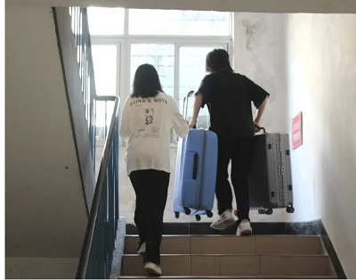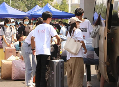 图为迎新志愿者引导新生上校园摆渡车,帮助新生搬运行李箱送至寝室